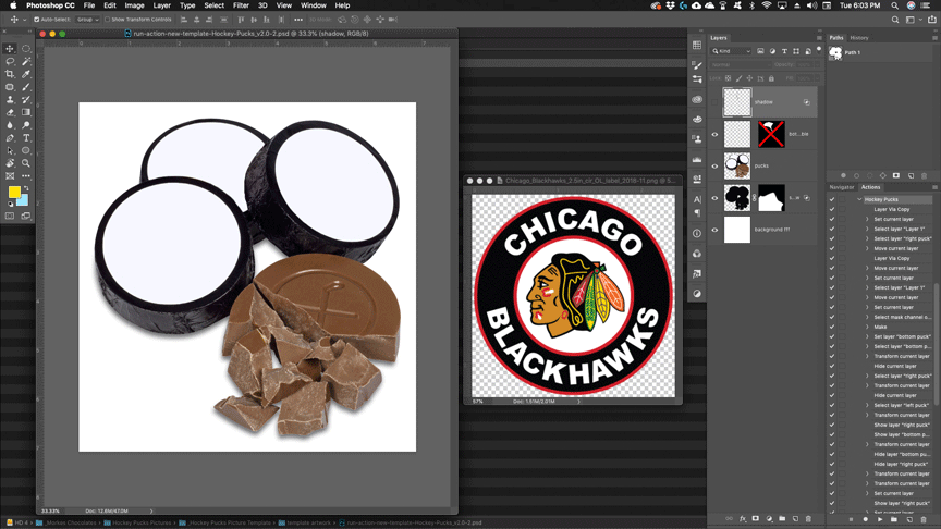 Photography Post Process: Label integration using Adobe Photoshop Automation. An NHL team label was imported onto the hockey pucks picture. An action script was created to place and correctly size the label for each puck in perspective and mask where necessary and add appropriate shadows. The automated process can now be used for all future puck labels even custom orders not affiliated with the NHL such as minor-league hockey teams, colleges and high schools and hockey clubs. View Photoshop Automation: Hockey Puck Label Integration Action Steps.